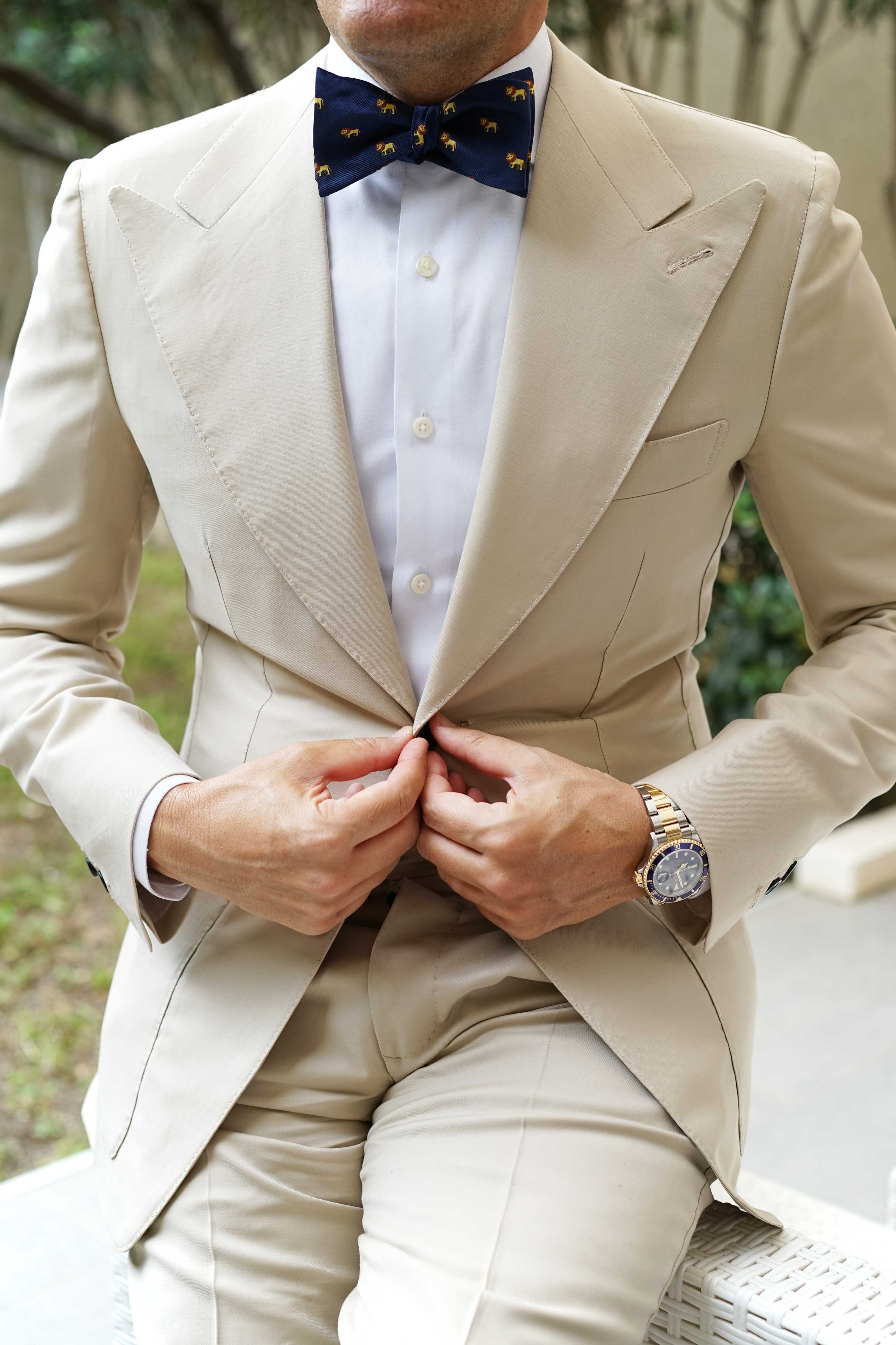 OTAA's African Lion Self Bow Tie is backed in a layer of deep navy - a nod to the brothers’ playful and functional aesthetic. The King of Beasts Lion array appliquéd is hand stitched, boosting this piece's cool appeal. Generally, lions can reach speeds of up to 81 km/h (50 mph) but only in short bursts because of a lack of stamina. Inspired by the king of the jungle, this African Lion Self Bow Tie will separate you from sheep to leader of the Animal Kingdom.