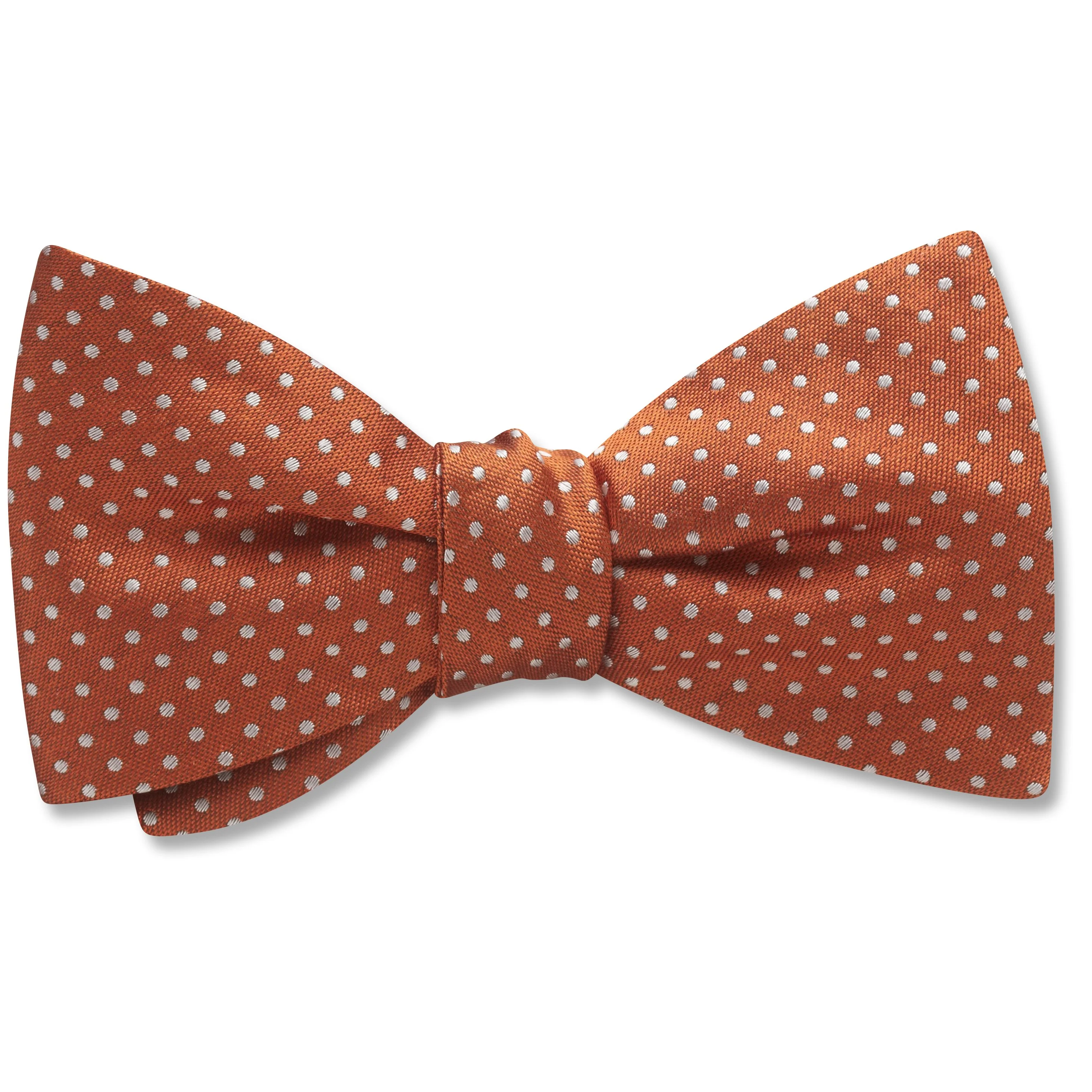 Small silver polka dots take this lovely shade of autumn orange woven silk to an entirely new level. Great for both formal and informal occasions, and never out of style.