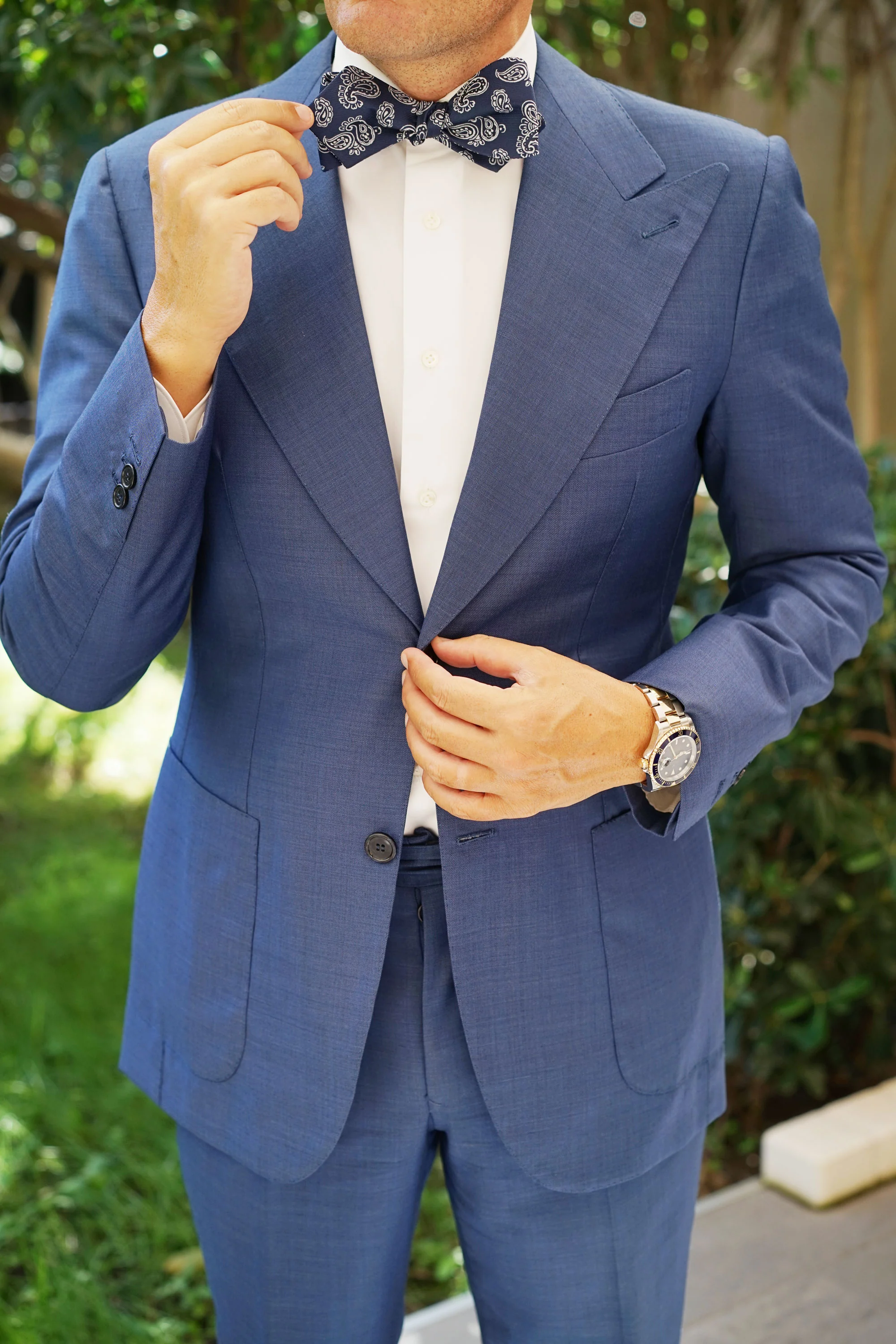 Uniquely designed and crafted by hand, the Paisley Navy Blue Self Tie Diamond Bow Tie is the cornerstone staple for gentlemen who seek true refinement. The Brothers at OTAA prize paisley designs, and this Paisley Navy Blue Untied Diamond Bow Tie went through a process of hand drawing, tailoring and hand-stitching before being parcelled up for you. The indulgent navy blue palette superbly complements the ebullient white paisley stitching that's embossed throughout. Worn by the kings of the Persian Empire, and now designed just for you; an incredibly sleek gentleman. Designed exclusively by the Brothers at OTAA.