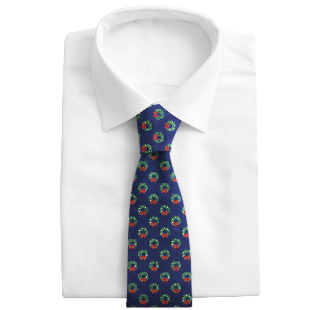 Green wreaths decorated with red ribbons neatly repeat on blue woven silk in this holiday charmer.