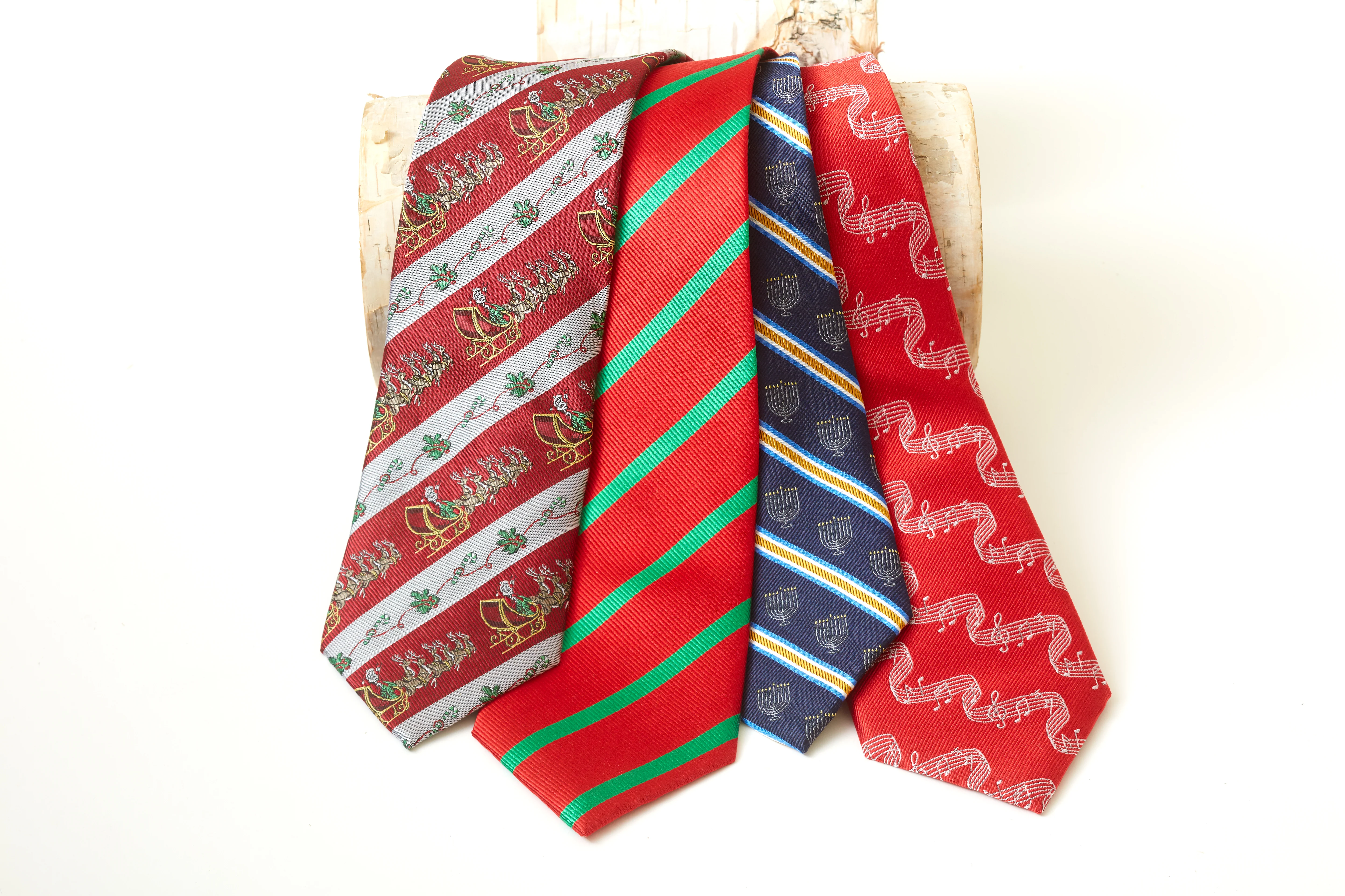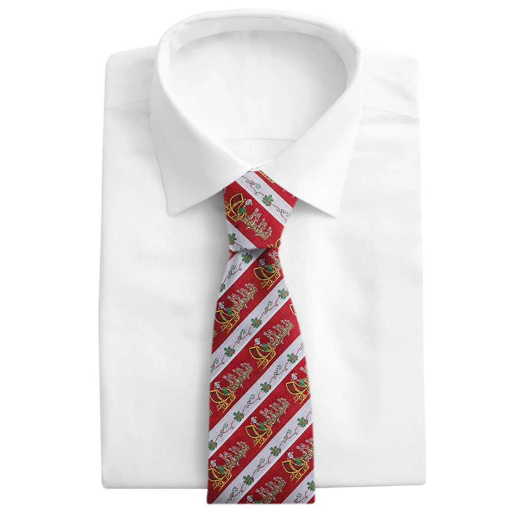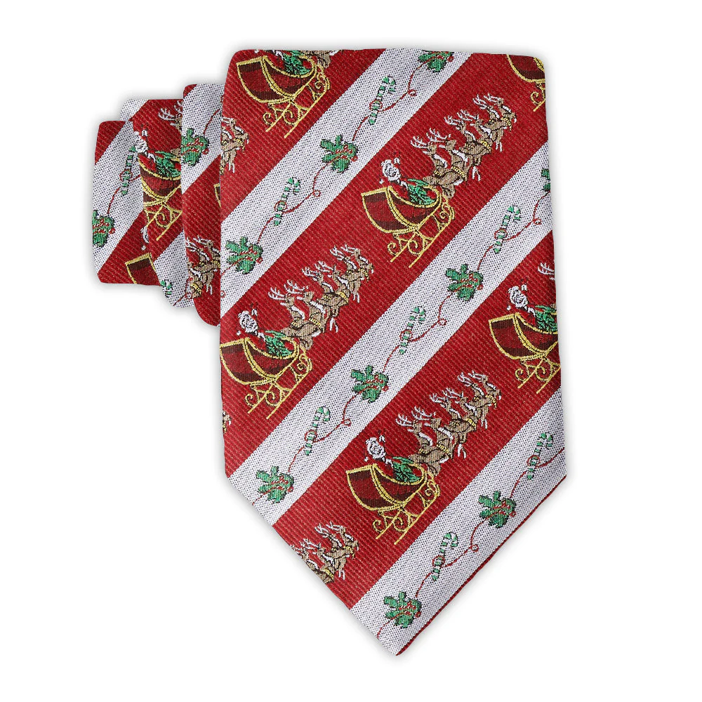 Celebrate the season with this oh-so-engaging design featuring Santa in his packed sleigh being pulled by his reindeer team through bright red stripes - each bordered by bands of silver dancing with holly boughs and candy canes - all in woven silk. Ho! Ho! Ho!